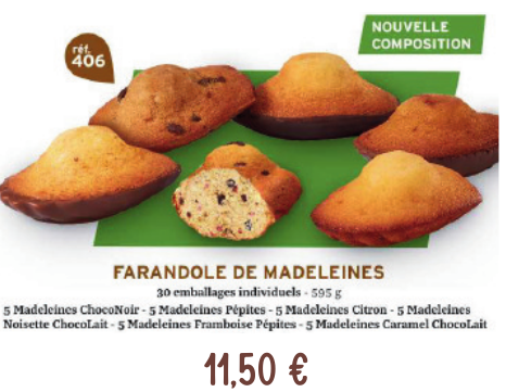Description du produit : Farandole de 30 madeleines (emballage individuel) (5 madeleines choconoir, 5 madeleines pépites, 5 madeleines citron, 5 madeleines noisettes choclait, 5 madeleines framboise pépites, 5 madeleines caramel chocolait)